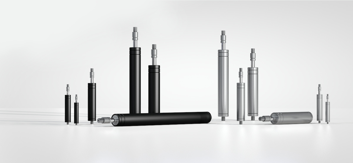 Mini gas springs small size and low pressure for compact assemblies and lighter doors.